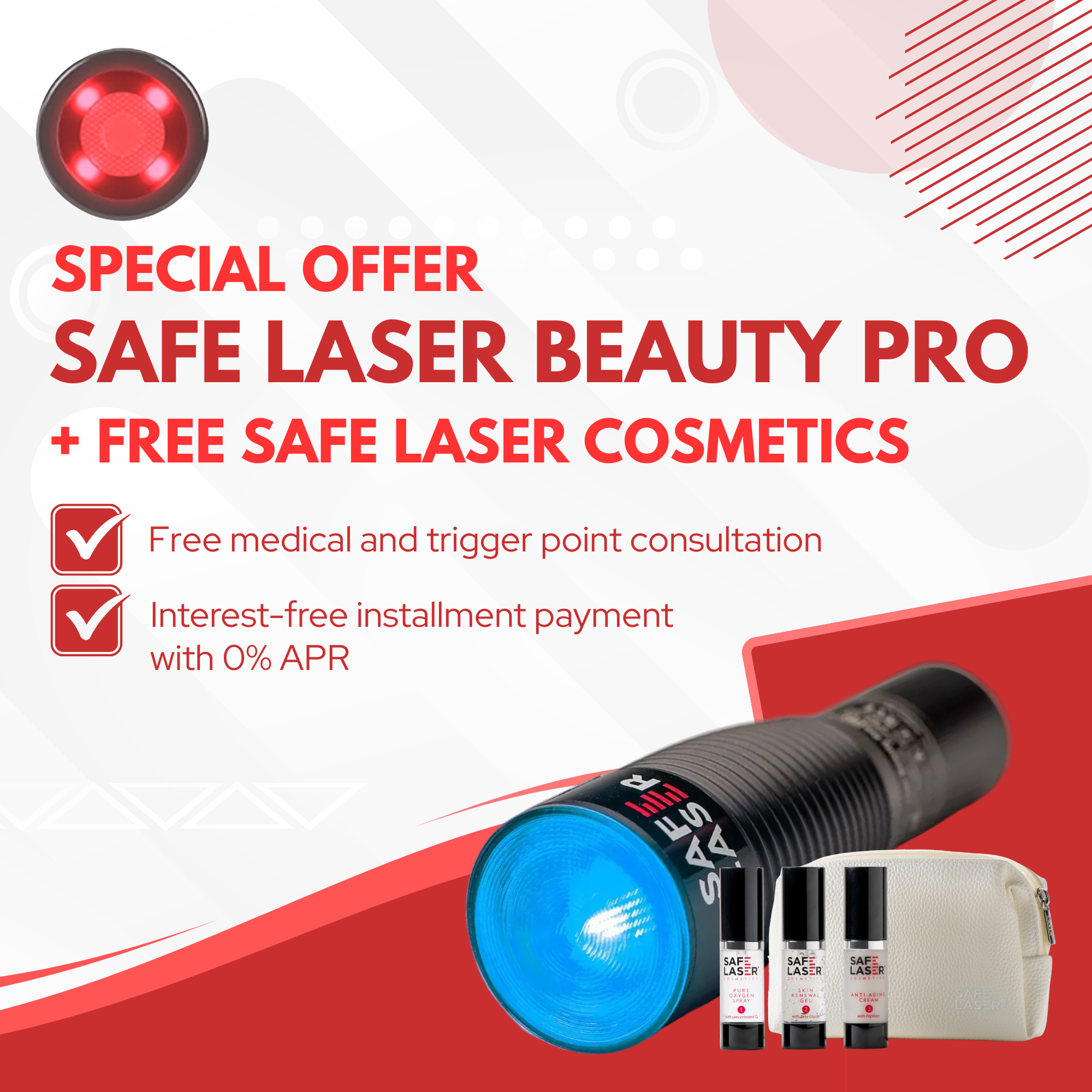 Uncertain? You can try it for free in our showroom, or consult with our Safe Laser specialist doctor to determine if the laser can be effectively applied to your problem. If that’s still not enough, test it at home for 2-5 weeks; the rental fee will be credited towards the purchase price if you buy it in a lump sum.